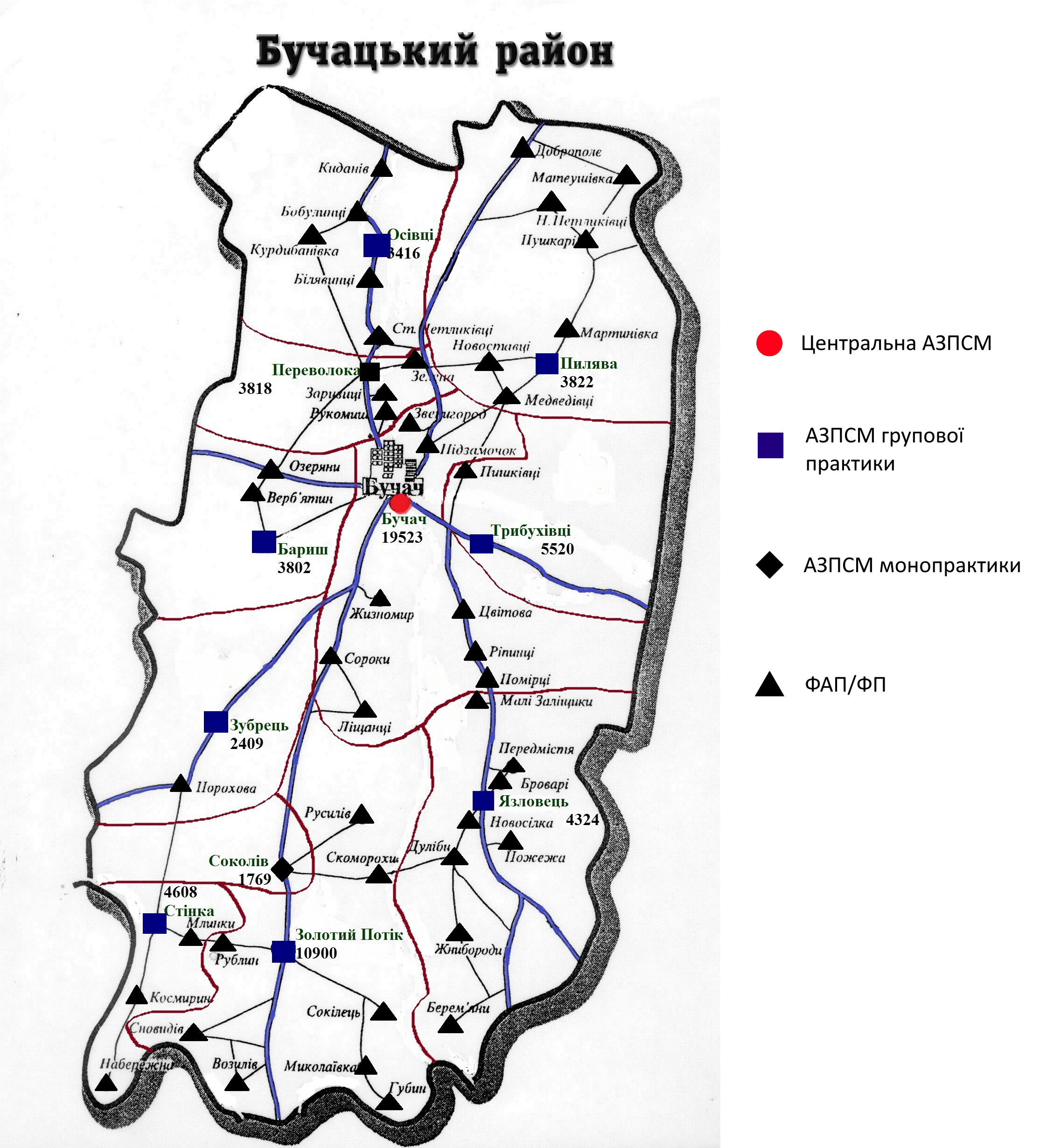 Станом на 1 січня 2019 року до складу КНП «Центру ПМСД» Бучацької районної ради входять 11 амбулаторій загальної практики сімейної медицини та 45 пунктів здоров’я(фельдшерсько-акушерських та фельдшерських пунктів).